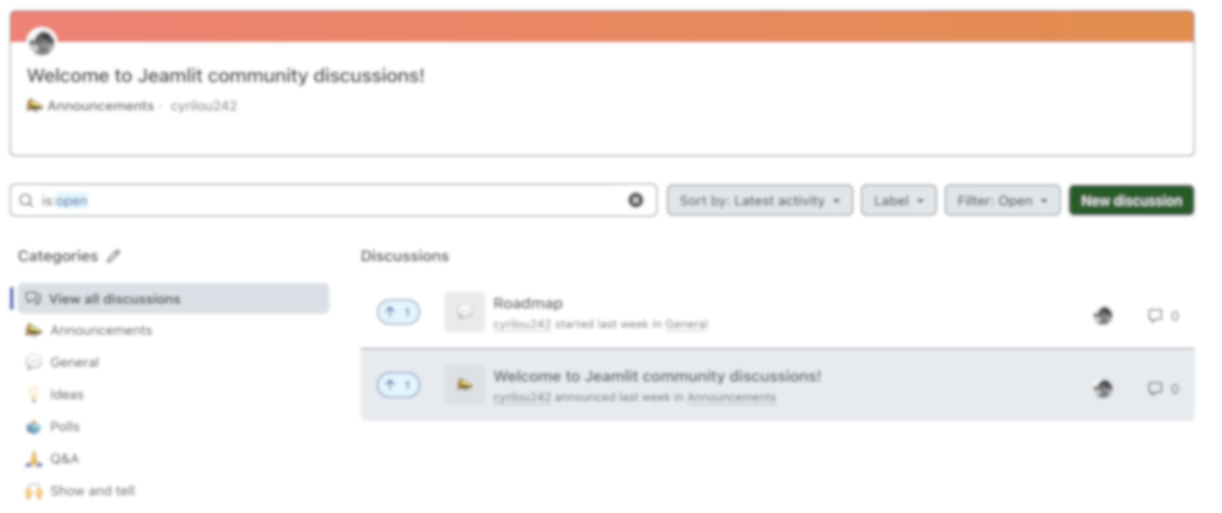 Jeamlit is more than just a way to make data apps, it's also a community of creators that share their apps and ideas, contribute to the codebase and help each other make their work better. Please come join us on the community forum. We love to hear your questions, ideas, and help you work through your bugs — stop by today!